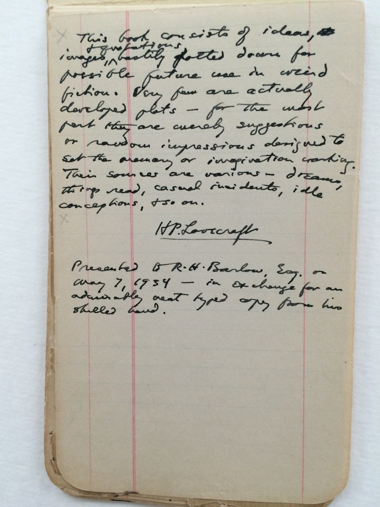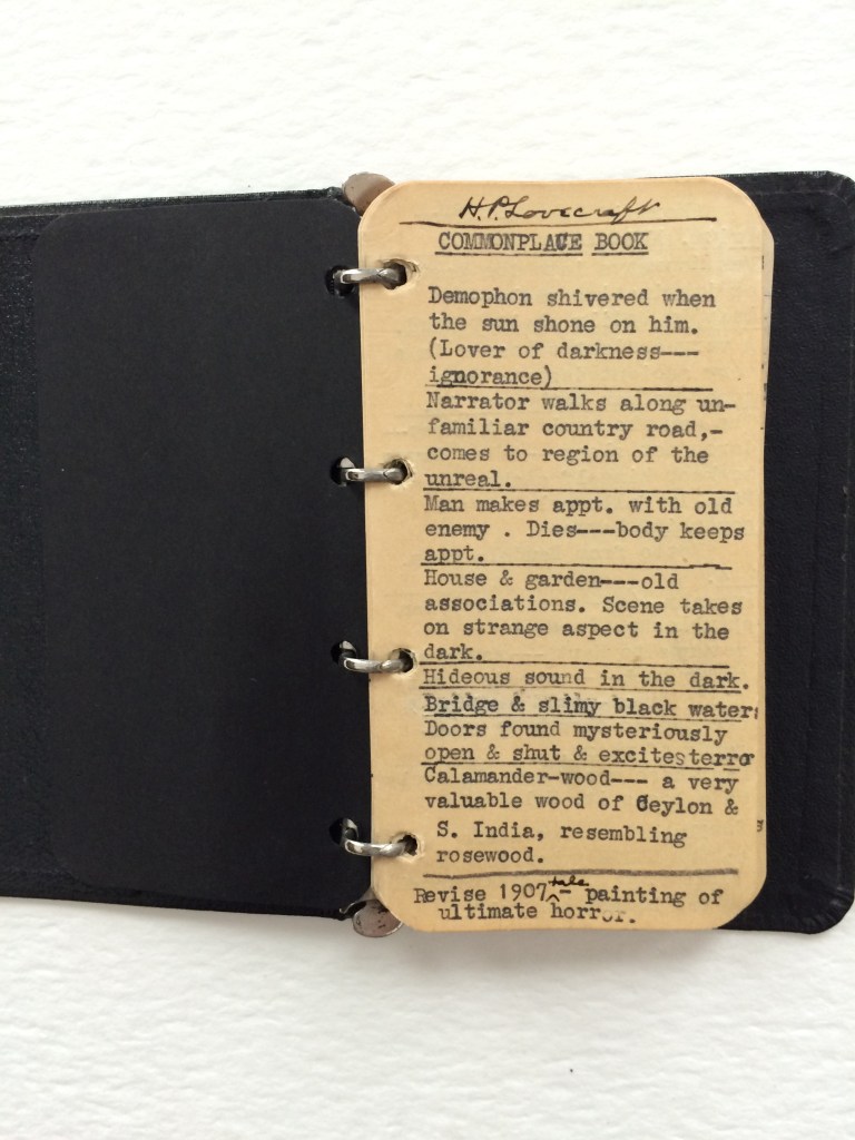 Per quasi vent’anni, dal 1918 al 1935, Lovecraft tenne un taccuino d’appunti (Commonplace Book) a cui ogni tanto, con grande parsimonia, aggiungeva qualche nota. Il Commoplace Book “… in realtà, poi, non era neppure un vero taccuino, ma una serie di fogli sciolti, piegati in due e inseriti l’uno nell’altro (lo scrittore cercava di risparmiare i soldi del cartolaio).” (1) Un taccuino vero e proprio si ebbe successivamente, quando, il 7 maggio 1934, Lovecraft consegnò il manoscritto all’amico Robert Hayward Barlow perché lo battesse a macchina.